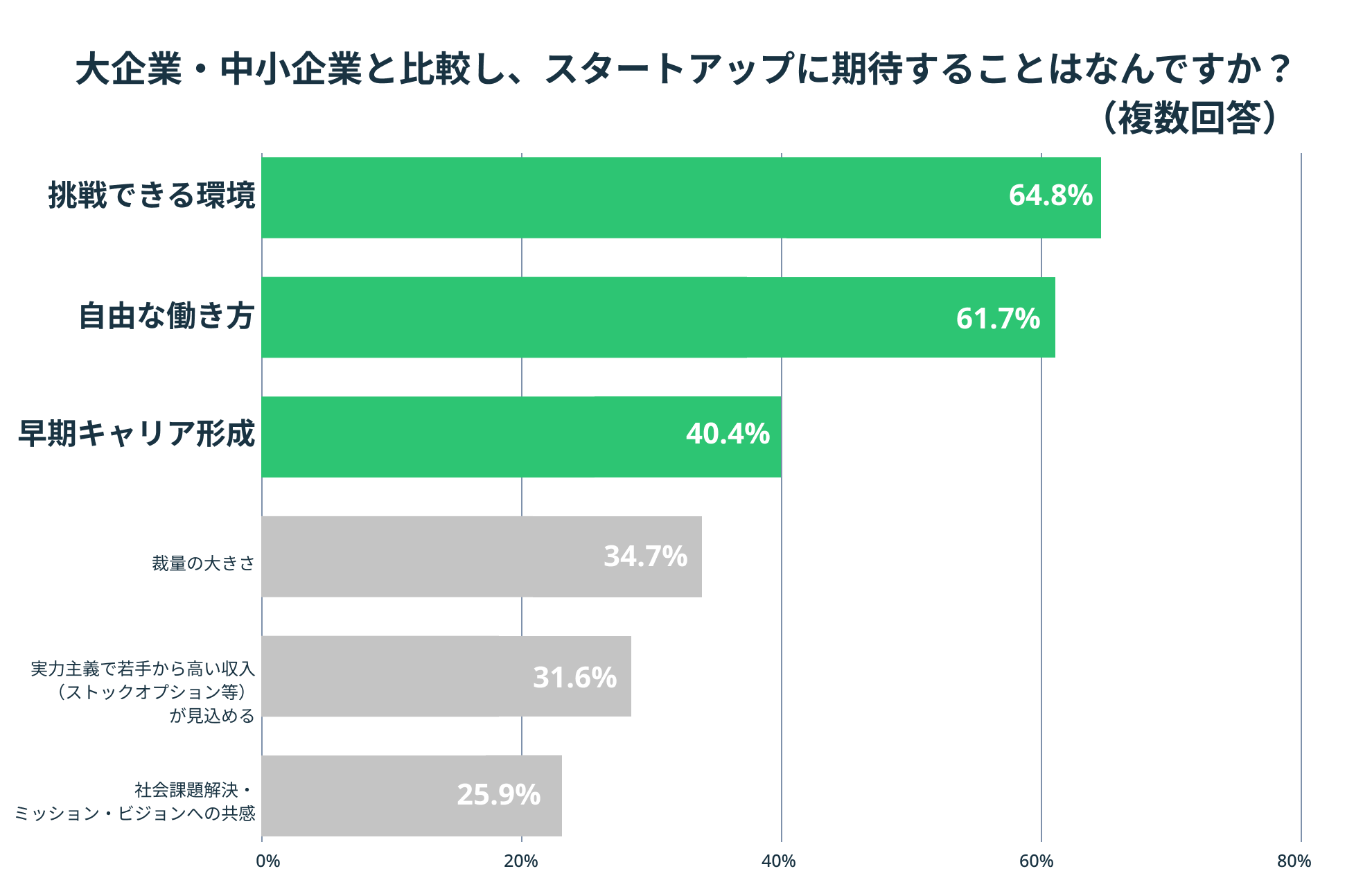 大企業や中小企業と比較した場合、学生がスタートアップに期待する要素として上位に挙がったのは、「挑戦できる環境(64.8%)」が1位、「自由な働き方(61.7%)」が2位、「早期キャリア形成(40.4%)」が3位であった。新型コロナウイルスの影響で外出制限が生じ、新たな学生生活を開始した状況から、「何か行動を起こさなければ」という意識が強まり、スタートアップに対する関心が高まったと考えられる。1年生や2年生の段階からスタートアップ企業のインターンに積極的に参加するなど、新たな挑戦への機会を求める学生の姿が見受けられた。
