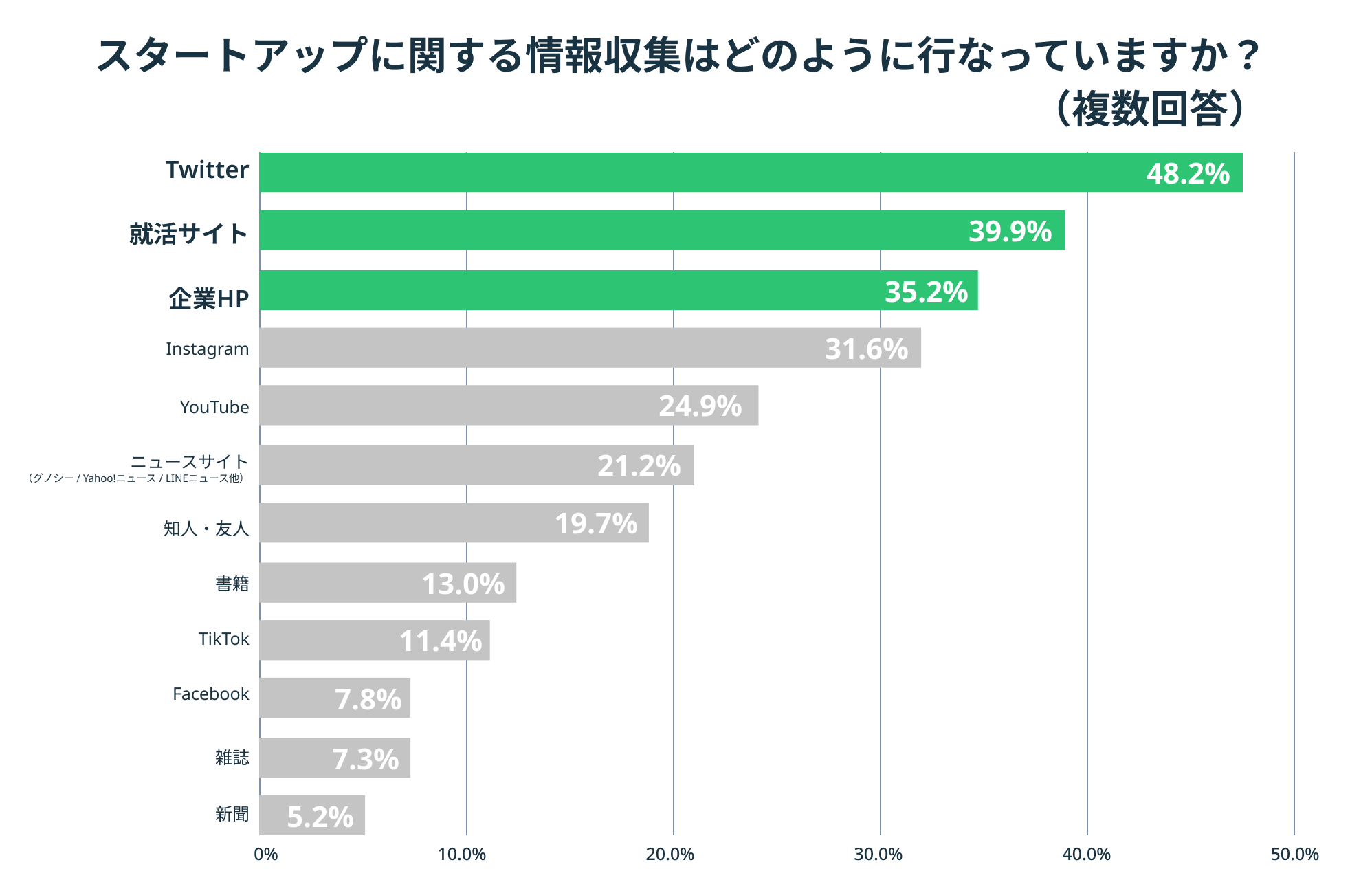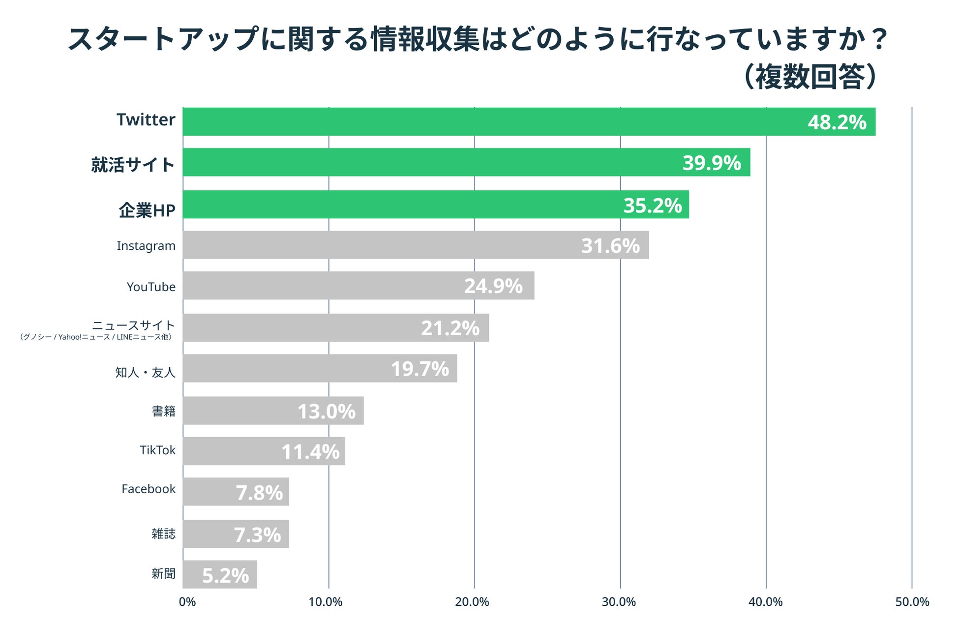 スタートアップに関する情報の収集方法については、1位「Twitter(48.2%)」、2位「就活サイト(39.9%)」、3位「企業HP(35.2%)」という結果となった。この結果は、特にZ世代の学生にとってTwitterが情報収集ツールとして重要な役割を果たしていることを示している。東京理科大学の3年生は、「Twitterは、Z世代にとって検索エンジンのようなものだ」と表現した。彼らは一般企業の選考フローや面接対策、スケジュール管理、マナーやルールなど、多岐にわたる情報収集にTwitterを活用している。また、スタートアップ企業に関する情報もTwitterから得ており、就活専用アカウントを通じて選考に有利な情報を効率的に把握しているようだ。